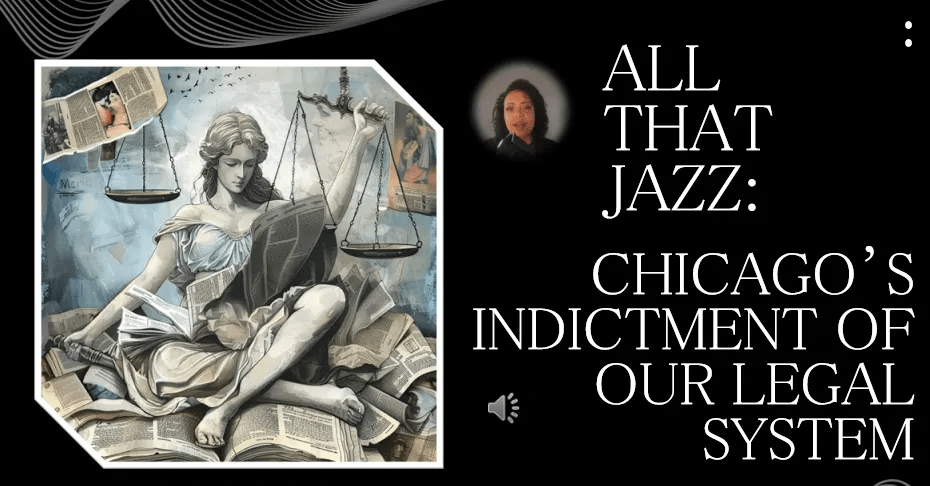 For our final assignment, we were asked to write a paper on a topic chosen from a list provided by the professor. As soon as I saw the title “ALL THAT JAZZ: Chicago’s Indictment of Our Legal System” on the list, I knew that would be my topic, for many reasons. I love art in all its expressions, so musicals are no exception—I admit it, I like musicals. Plus, jazz is one of my favorite music genres. Additionally, “Chicago” is my mother’s favorite musical, and she made us watch it countless times as we were growing up. In fact, in January 2022, I had the pleasure of taking her to see it on Broadway, and then in November of the same year, I went again with my daughter as part of her assignment for her magnet school’s Musical Theater program.